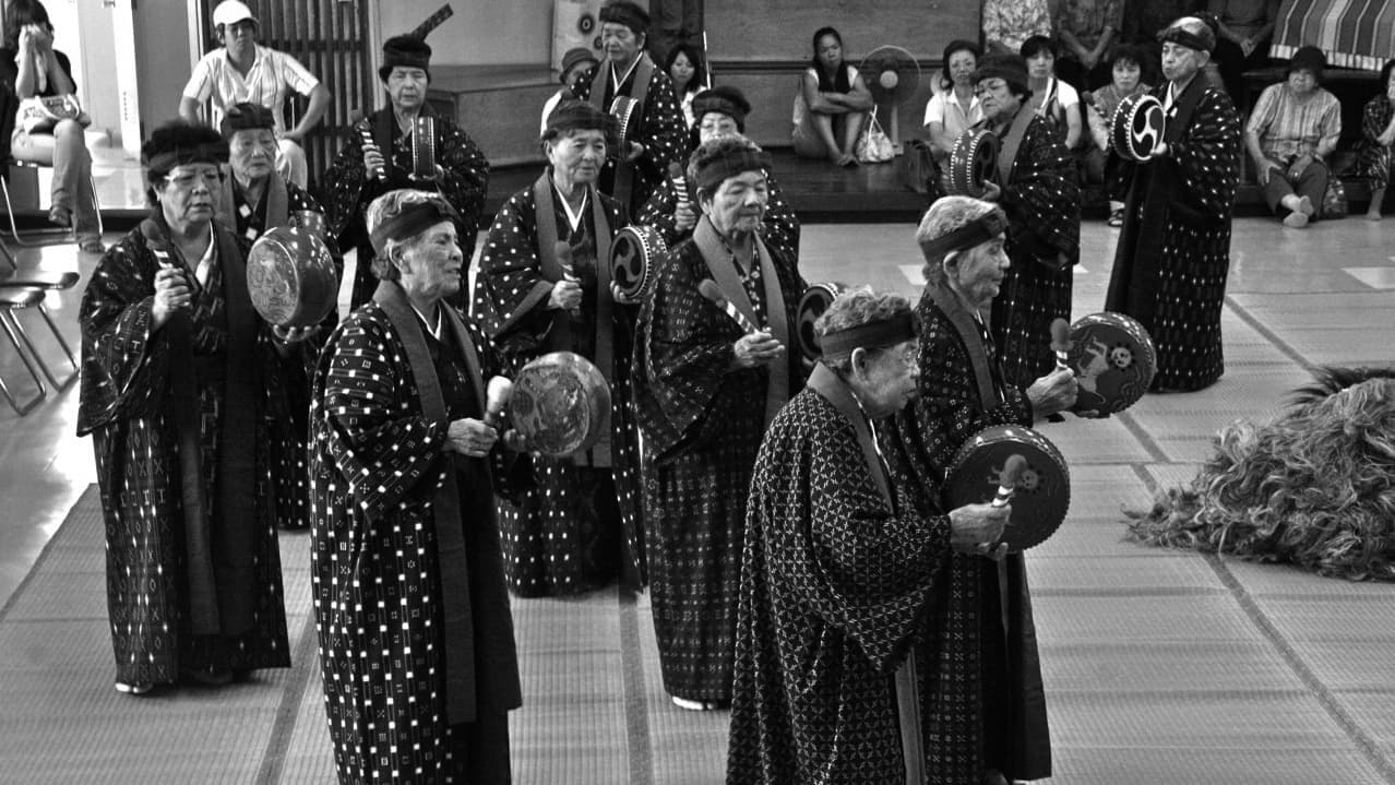 通常は大切に保管されている「ワタジン」と「ドゥージン」と呼ばれる衣装を着用し、臼太鼓を叩きながら唄と舞踊を披露します。